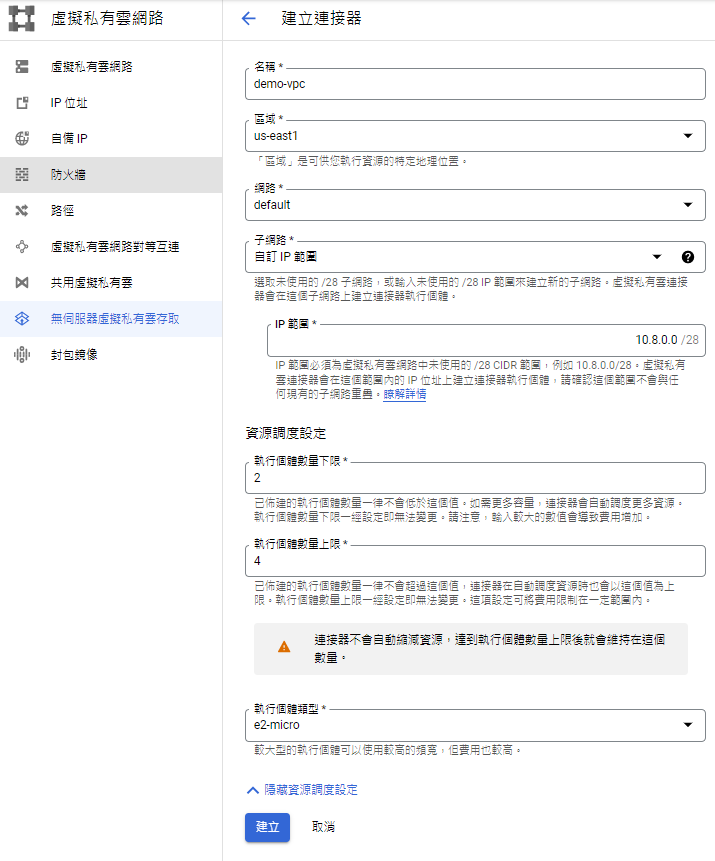 啟動 Serverless VPC Connector,會依使用量自動啟用 GCE