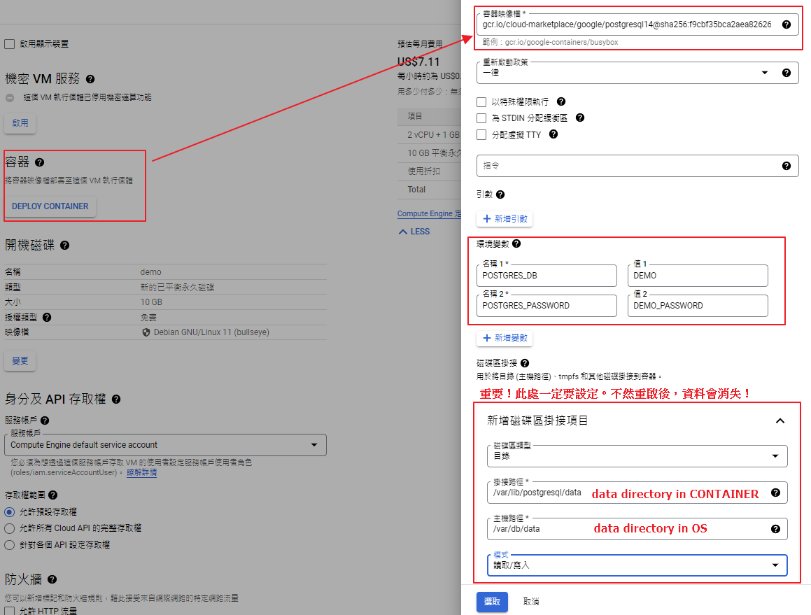 POSTGRES_DB、POSTGRES_PASSWORD,輸入想要的資料庫名與密碼。預設登入帳號是postgres - 重要! 磁碟區掛接,要將容器裡的資料掛載出來。否則當VM重啟、暫停,資料會消失!