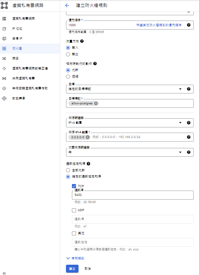 網路標記(Target tags)增加剛剛建立的allow-postgres - 按儲存